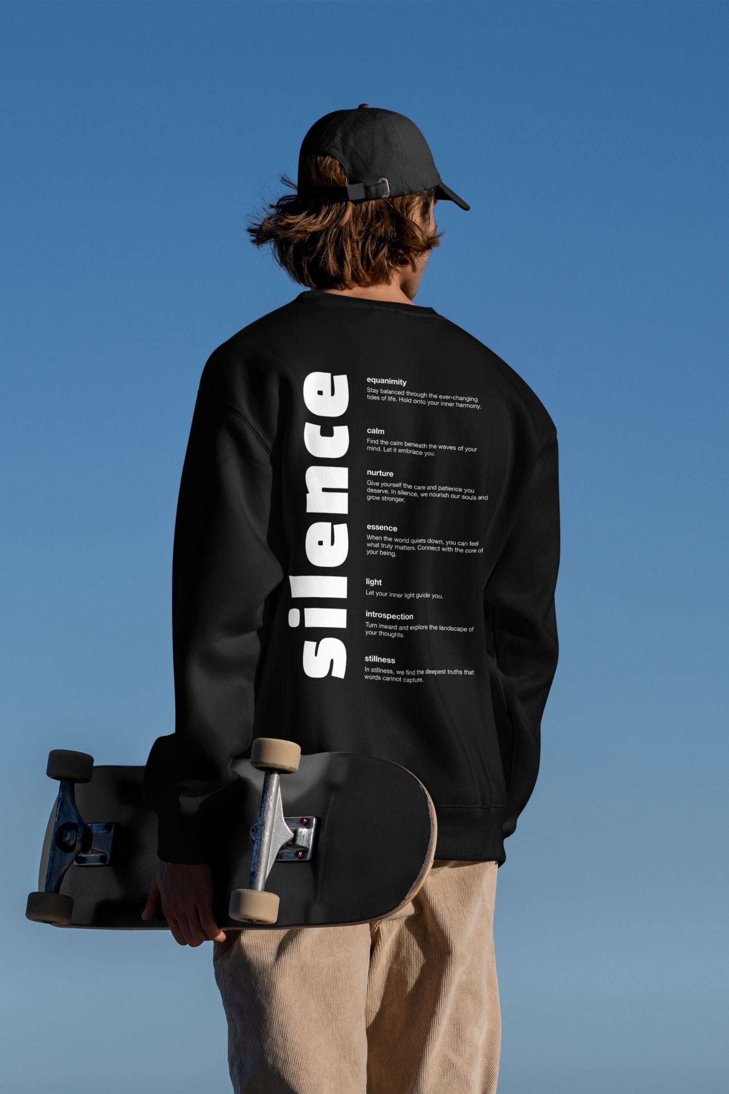 Das Silence Sweatshirt erinnert dich daran immer wieder innezuhalten, in dich hineinzulauschen und aus deiner inneren Ruhe Kraft zu schöpfen. Mit dem inspirierenden Rückenprint wirst du auch für andere eine Erinnerung sein, sich Zeit für Stille zu nehmen und zurück zu sich selbst zu finden.