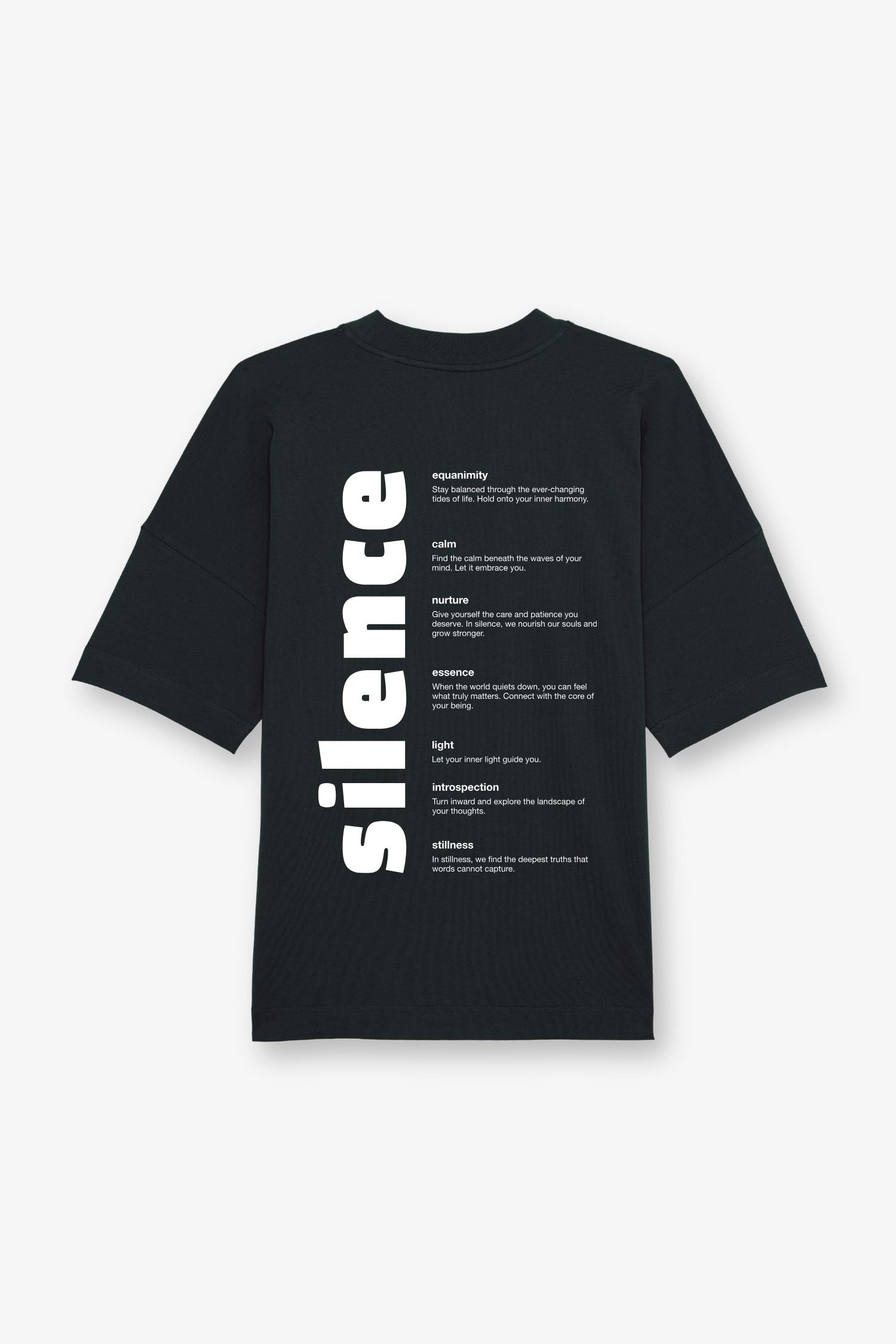 Das Silence T-Shirt erinnert dich daran immer wieder innezuhalten, in dich hineinzulauschen und aus deiner inneren Ruhe Kraft zu schöpfen. Mit dem inspirierenden Rückenprint wirst du auch für andere eine Erinnerung sein, sich Zeit für Stille zu nehmen und zurück zu sich selbst zu finden.